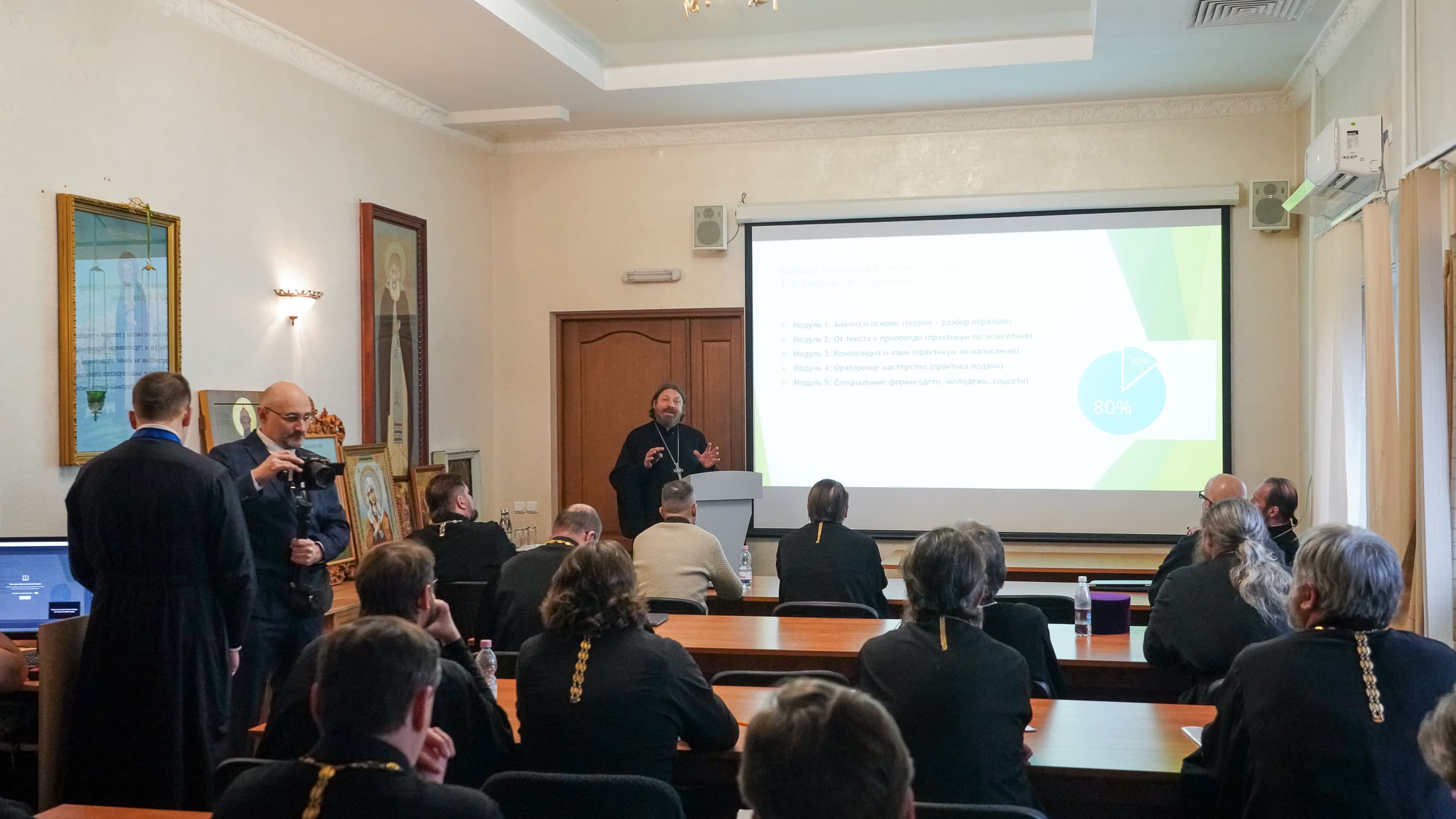 Дальнейшая работа курсов продолжилась в рамках двух секций: «Гомилетика» (модератор архимандрит Симеон (Томачинский)) и «Пастырское богословие» (модератор иерей Андрей Лысевич).