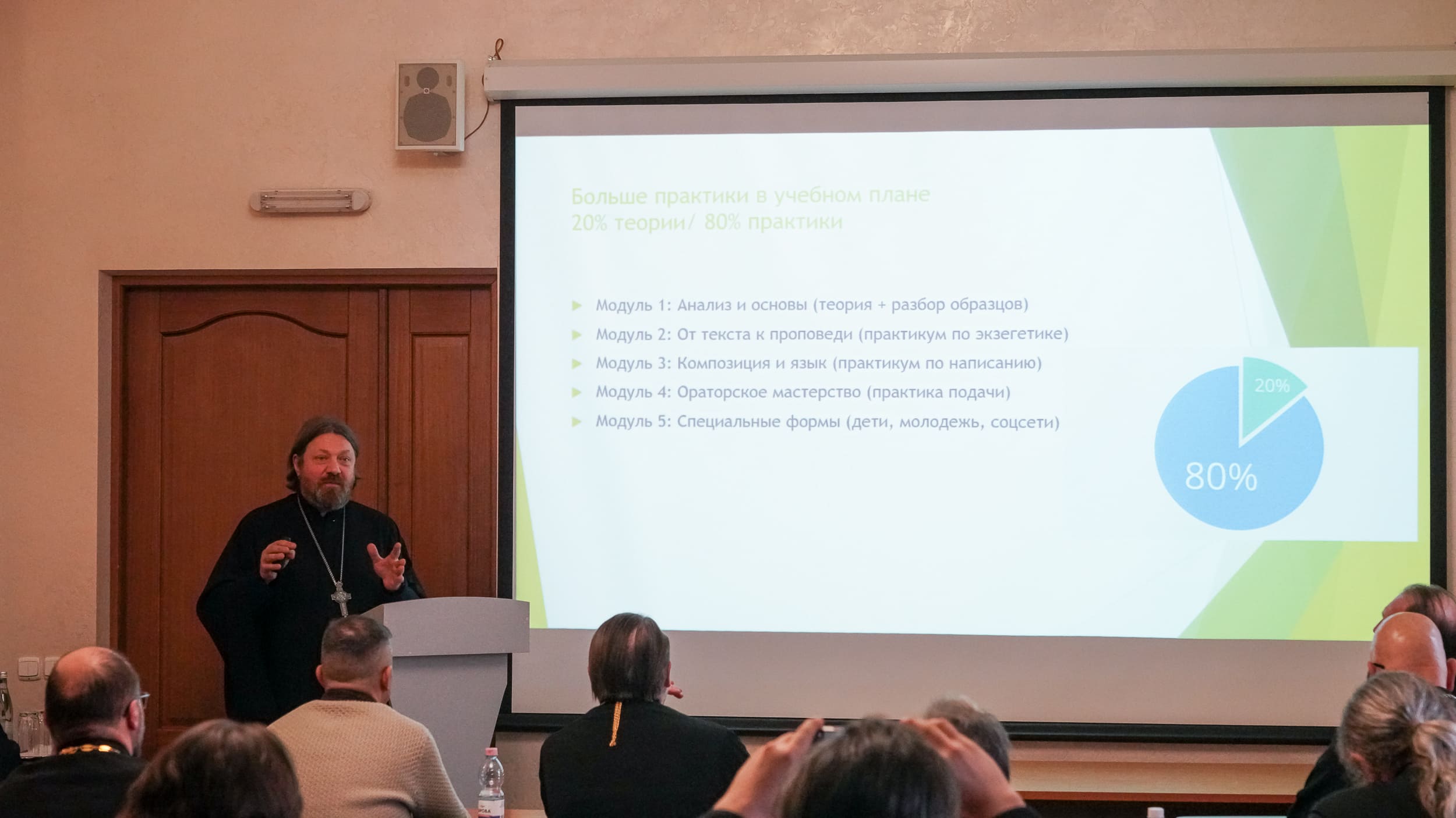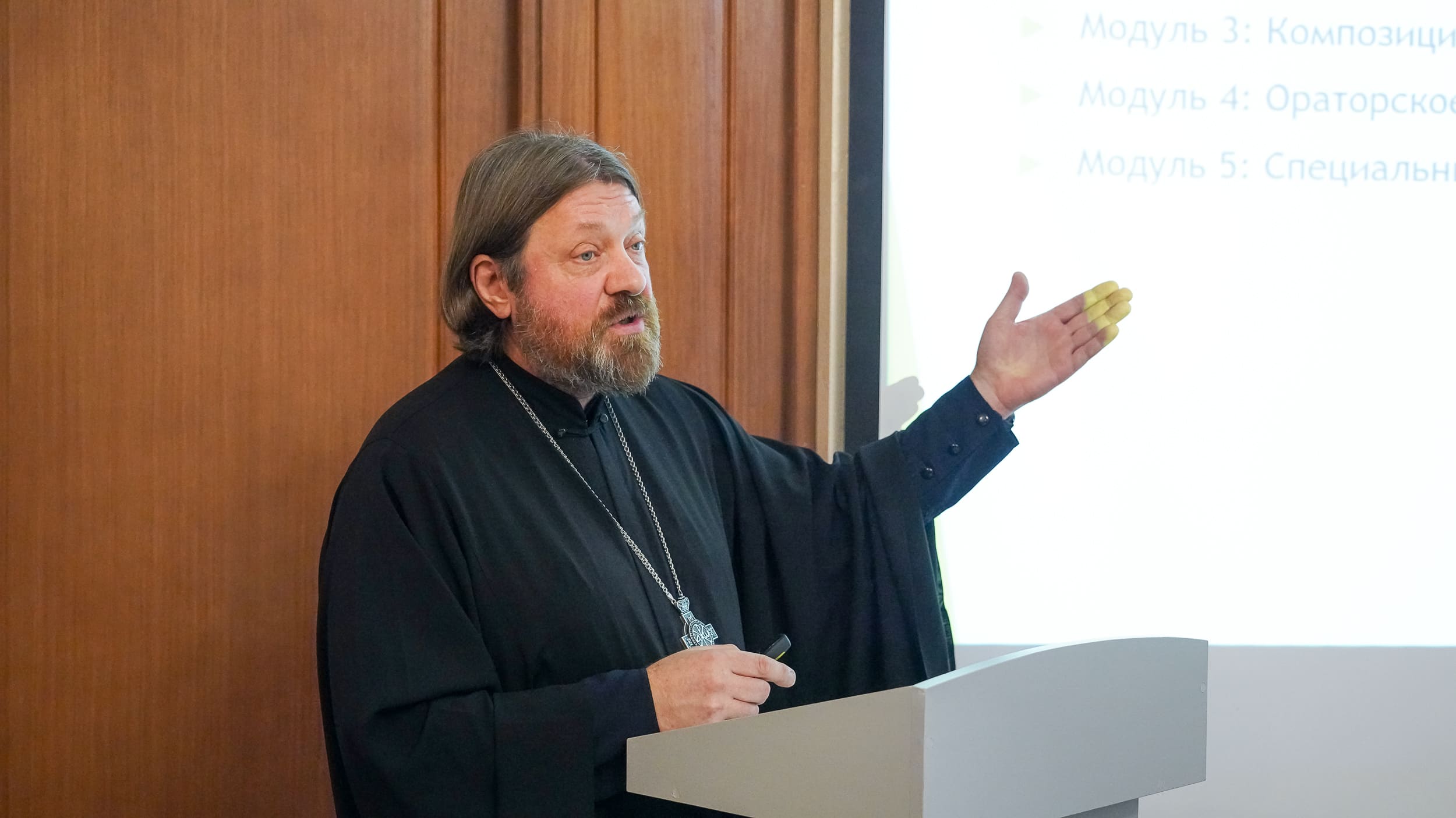 На секции «Гомилетика» свой доклад представил Ректор Белгородской семинарии протоиерей Алексий Куренков. Он поделился своими размышлениями о том, как сделать гомилетику ориентированным на практику предметом.
